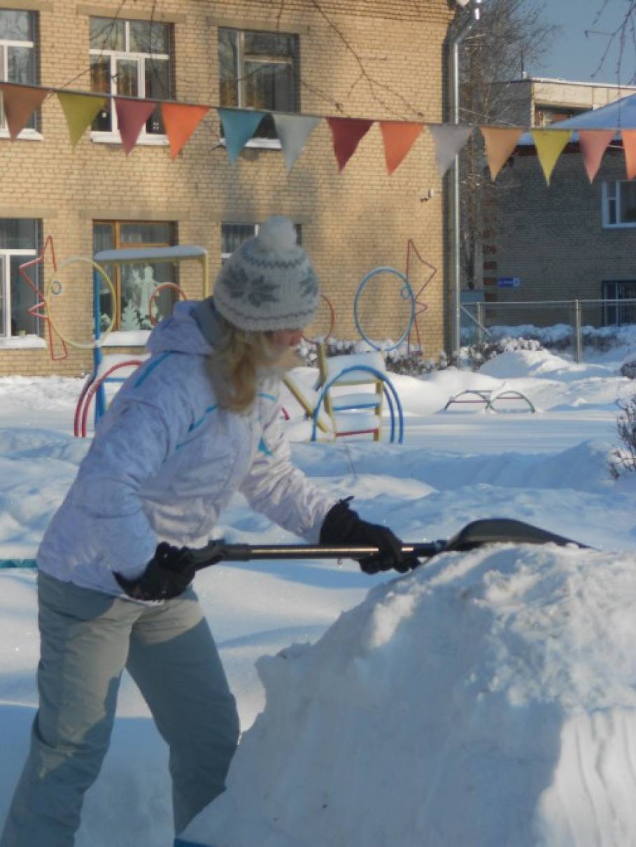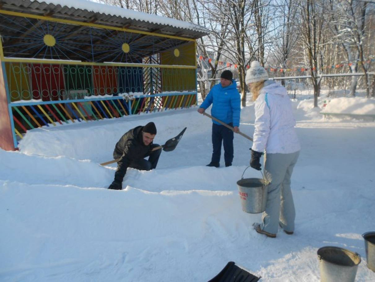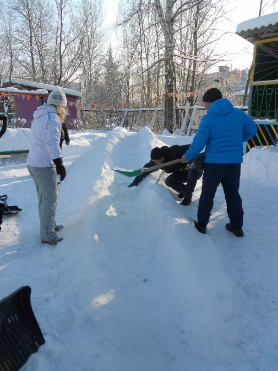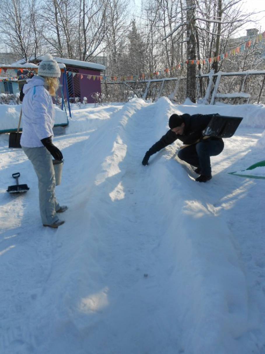 Зима до Нового года нас снегом не баловала, даже после новогодних каникул у нас было мало снега — нельзя было даже горку сделать, не говоря о других постройках. Но в 20 числах января небо «прохудилось», обильные снегопады были круглосуточно и несколько дней подряд. Снега насыпало столько, что пришлось приглашать родителей в выходной день, чтобы расчистить участок к прогулке в понедельник, да и построить кое — что для ребят. Был довольно крепенький морозец, но работали быстро и легко. Мои родители очень скромные и не любят позировать, поэтому старалась запечатлеть, пока не видят. Некоторые родители вообще в кадр не вошли — не смогла сфотографировать, чтобы не заметили.