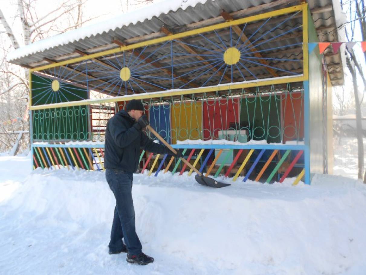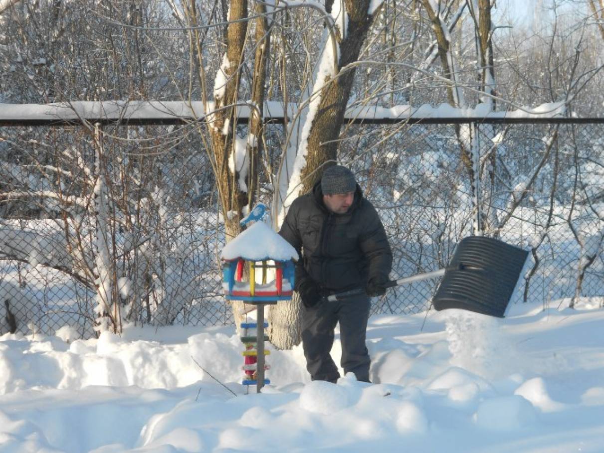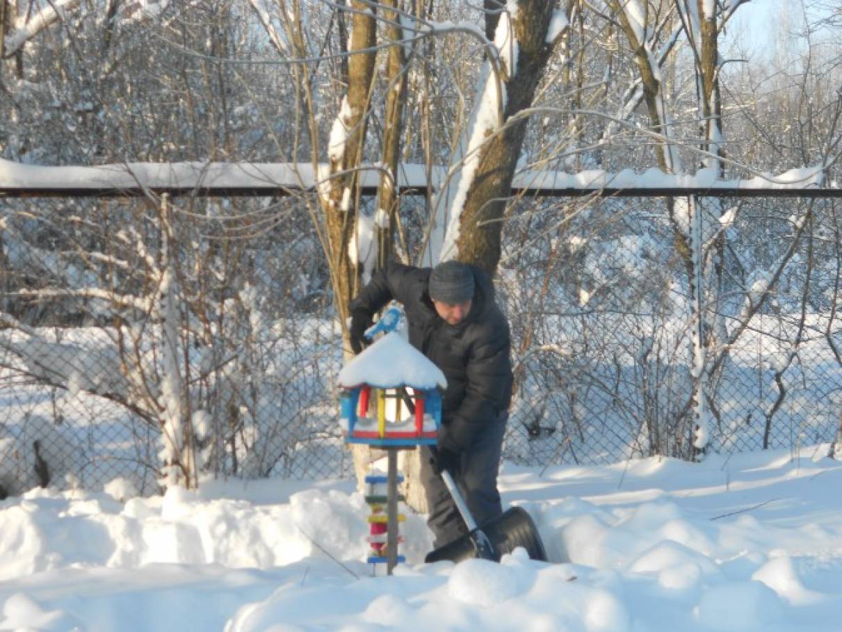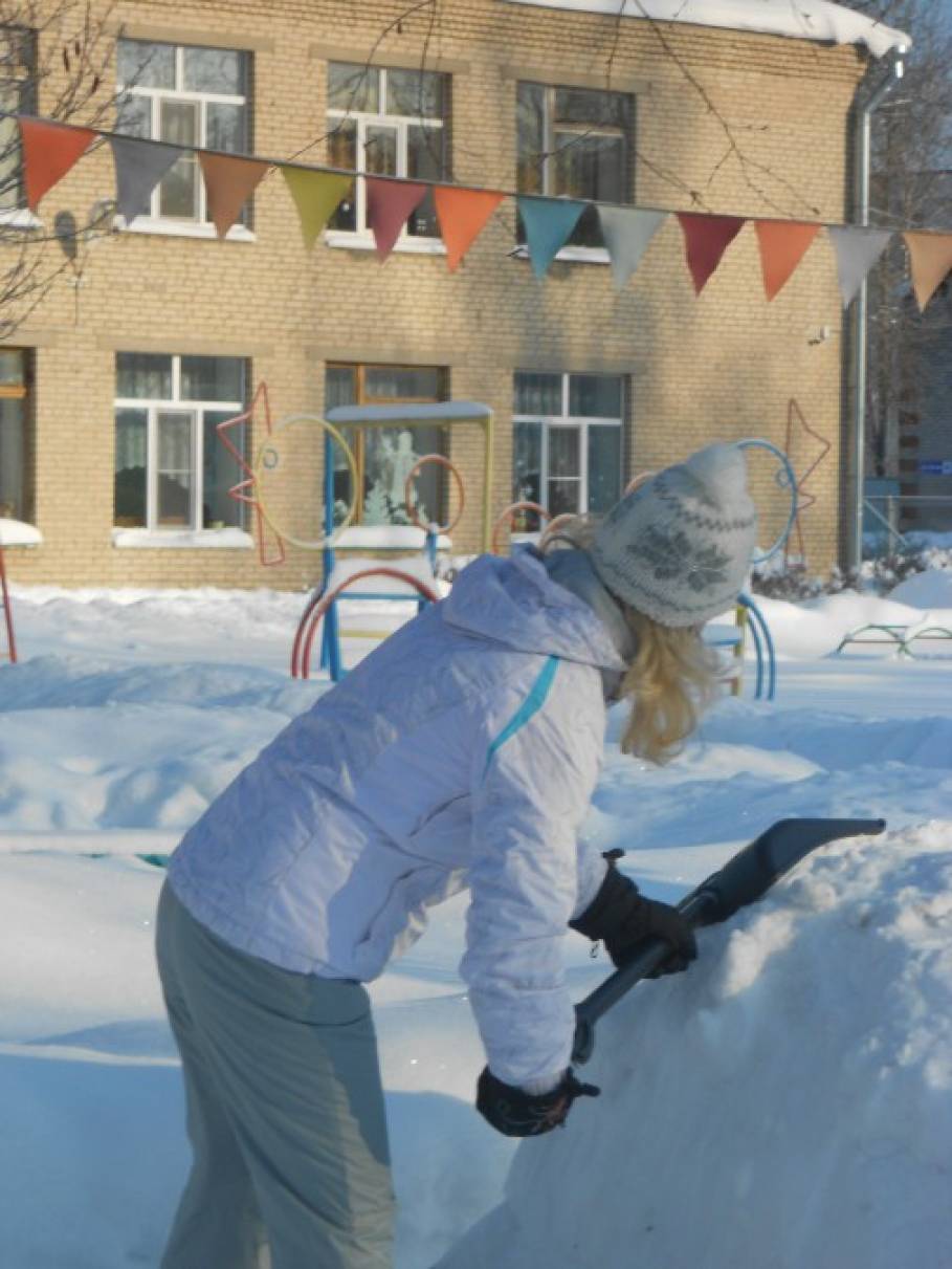 Зима до Нового года нас снегом не баловала, даже после новогодних каникул у нас было мало снега — нельзя было даже горку сделать, не говоря о других постройках. Но в 20 числах января небо «прохудилось», обильные снегопады были круглосуточно и несколько дней подряд. Снега насыпало столько, что пришлось приглашать родителей в выходной день, чтобы расчистить участок к прогулке в понедельник, да и построить кое — что для ребят. Был довольно крепенький морозец, но работали быстро и легко. Мои родители очень скромные и не любят позировать, поэтому старалась запечатлеть, пока не видят. Некоторые родители вообще в кадр не вошли — не смогла сфотографировать, чтобы не заметили.