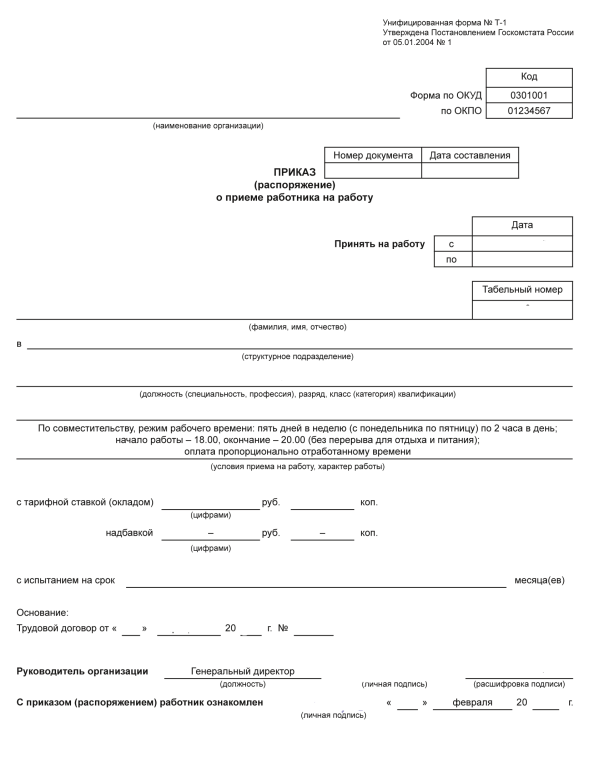- Издают и подписывают приказ о назначении сотрудника на должность главного бухгалтера по совместительству (ч. 1 ст. 68 ТК РФ). Кадровик вправе воспользоваться для создания приказа унифицированной формой Т-1 или составить собственный шаблон. При этом важно в графе приказа об условиях приема на работу и характере деятельности указать «совместительство». В приказе можно продублировать условия трудового договора, а можно указать информацию кратко. Рекомендуем прописать в приказе график работы сотрудника-совместителя. Это позволит избежать многих проблем в дальнейшем.