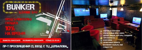 Анти кафе и lounge-пространство Бункер на Метро «Проспект Просвещение». Проспект Просвещения 21/139 ( Проспект Энгельса 139/21 ) Здорово, когда анти кафе соединяется с уютным заведением, где угощают кальянами, сэндвичами 🌯 и коктейлями. Бункер — новое заведение, объединившее анти кафе и бар с авторской кухней, где можно • насладиться безлимитным дымным кальяном, • заказать любимый напиток из бара, алкогольный или нет, • отведать Бургеры Пиццы Сэндвичи, сделанный с особой заботой, • хвастаться личными рекордами в 🕹 PS4 перед друзьями, • лакомиться бесплатным угощением и свежим листовым чаем, • отдохнуть и расслабиться в приятной атмосфере. Бункер работает каждый день с 14:00 до 04:00, самое подходящее время для расслабления и общения с друзьями. Плата за первый час 300 ₽, далее 3 ₽ в минуту с человека. М. «Проспект Просвещения Дом Проспект Просвещения 21/139 ( Проспект Энгельса 139/21 ) ☎ +7 981 — 745 — 00 — 13 +7 960 — 237 — 02 — 00