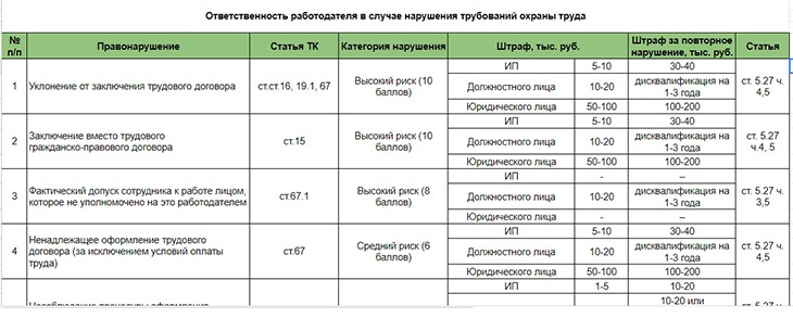 Ознакомьтесь с таблицей » Ответственность работодателя за нарушение требований охраны труда», содержит информацию практически по всем возможным нарушениям.