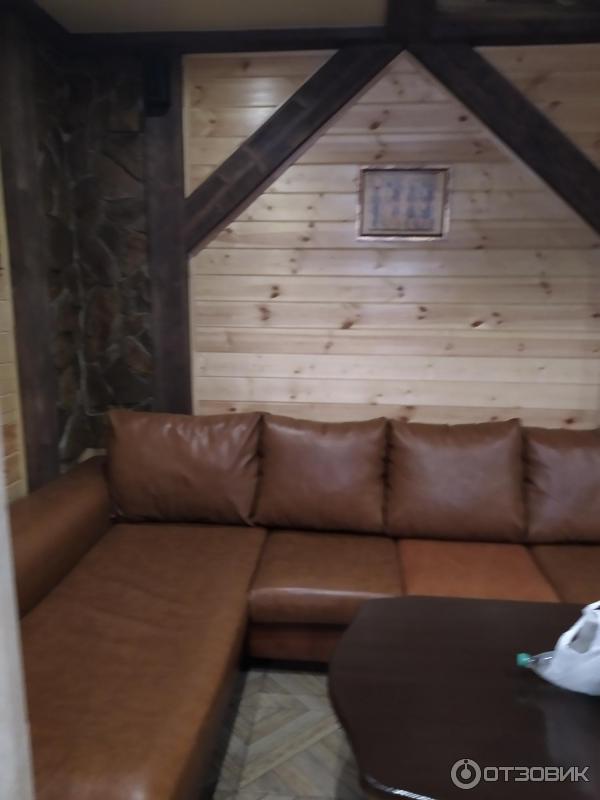 Имеется телевизор и автомат с караоке(платный). Имеется большой угловой кожзам. диван и длинный красивый стол, много стульчиков. За столом можно расположить человек 10. На столе есть салфетки, можно взять посуду у администратора.