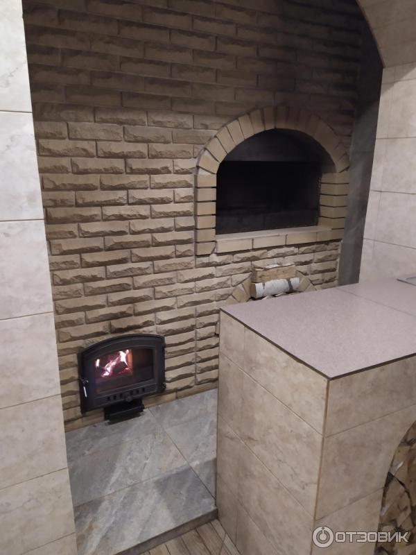 Парилка на одного лежачего и пару сидячих мест. Либо на 5 сидячих- вполне комфортно. Для повышения влажности водой можно поливать на камни и сразу повышается температура и влажность. Дрова в топку сами подкидываем- необычно и красиво.