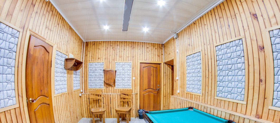 Не хочется в бассейн? Не беда! Вместо этого можно провести время в нашей комнате отдыха. Мы ставили своей целью создать здесь уютный, практичный интерьер из преимущественно натуральных, безопасных материалов, подобрать мебель, которая будет в равной степени удобной и красивой. Надеемся, что вам понравится! Для поддержания атмосферы отдыха мы можем предложить вам бильярд.