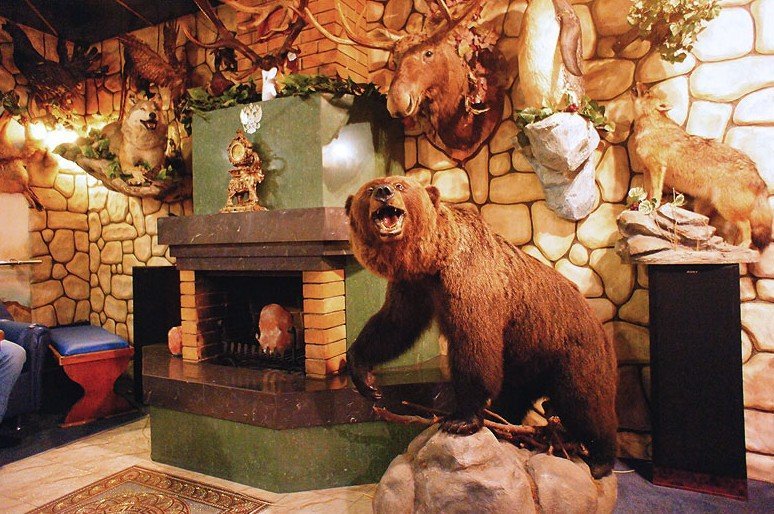 Стены помещений украшены различными декоративными покрытиями и охотничьими трофеями.