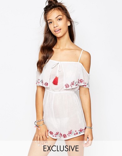 Пляжный ромпер Wolf & Whistle Легчайшая ткань Мягкая пряжа Квадратный вырез Разрезы на плечах Отделка вышивкой Кисточки спереди Узкие регулируемые бретельки Эластичный пояс Свободный крой Ручная стирка 100% хлопок Эксклюзивно для ASOS