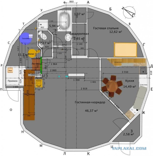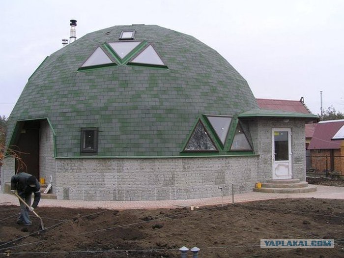 У меня знакомый давно живет в таком купольном доме. Правда побольше ( метров 350 только первый этаж) и второй этаж сделан типа балкона. И этот балконный вариант — единственная ошибка, горячий воздух весь улетает кверху.