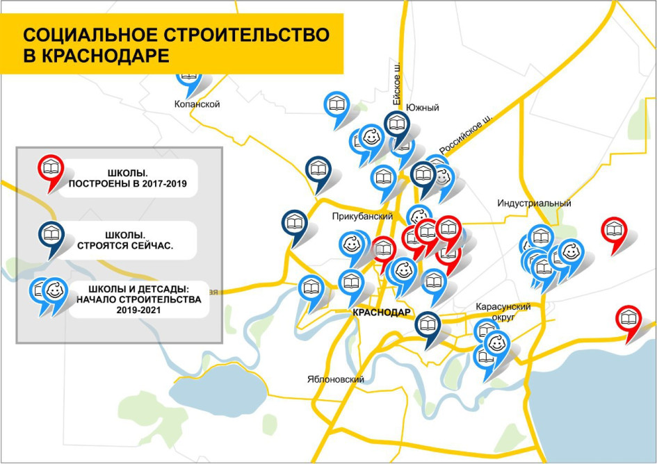 На данный момент в Краснодаре уже строят 5 школ, и до конца года планируется начать возведение еще пяти объектов. Это школы в микрорайоне Гидростроителей, в Новознаменском жилом районе, в ЮМР (корпус к 87-й школе), детсады на ул. Героев-Разведчиков и ул. им. Калинина.