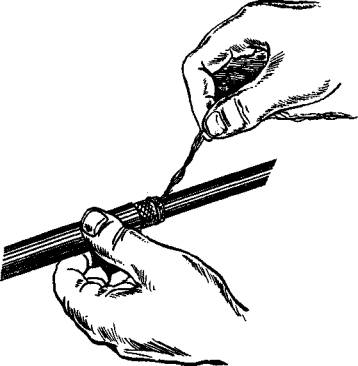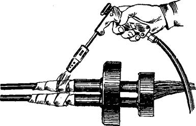 На соединения наносят пасту ПБК-26М и все проволоки и бандаж пропаивают припоем ПОССу 30-2 электрическим и жаровым паяльником. Затем место пайки протирают ветошью, смоченной в бензине.
