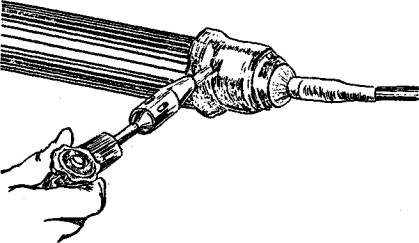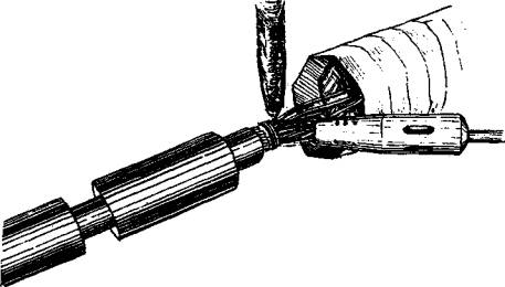 7.13.2. Установить внутреннюю камеру на свое место в муфте. На сердечник кабеля надвинуть фигурный сальник, который вложен в прорезь камеры. Стальные проволоки брони соединить между собой скруткой с пропайкой. Соединение производить в шахматном порядке с изолированием скруток полиэтиленовой гильзой (если проволоки имеют полиэтиленовую оболочку).