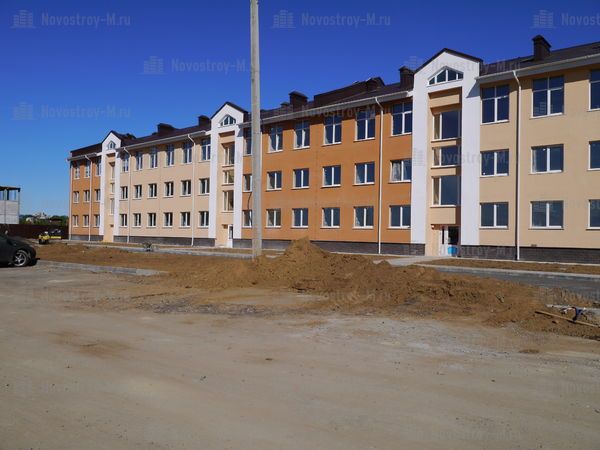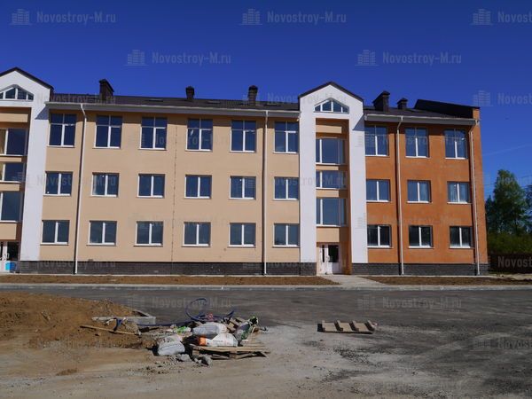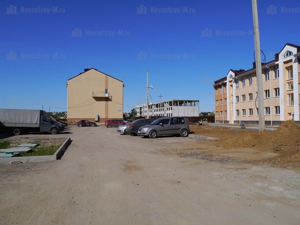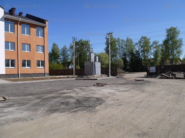 Я увидела три дома: заселенный первый корпус; построенный, но еще не подключенный к коммуникациям второй; а также строящийся третий корпус, где сейчас ведется устройство газобетонных стен третьего этажа (все квартиры в нем уже проданы). В будний день в разгар рабочего дня никакой особенной активности я не обнаружила: пара рабочих не спеша ровняли площадку для газона перед вторым домом, ведущихся работ по третьему дому я не заметила.