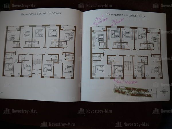 Первый и второй этажи состоят исключительно из студий и 1-комнатных квартир метражом от 20 до 30 квадратных метров. Однако можно выкупить несколько штук и объединить их в двух- или даже трехкомнатную квартиру. Варианты объединенных планировок частично, но не все выложены на сайте и пропечатаны в буклете.
