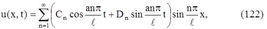 Итак, мы доказали, что ряд (122), где коэффициенты Cn и Dn определены по формулам (124) и (125), если он допускает двукратное почленное дифференцирование, представляет функцию u (x, t), которая является решением уравнения (107) и удовлетворяет граничным и начальным условиям (108) – (111).