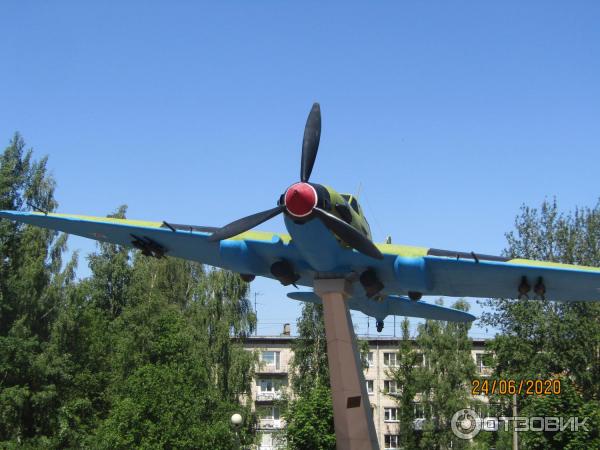 Интересно, что самолёт, который мы видим, это реальный штурмовик ИЛ-2 пропавший без вести в 43-м, и найденный в болотах ещё в советское время. После же реставрации, уже в начале нынешнего века, этот самолёт был включён, как составляющая часть, в памятник «Защитникам Ленинградского неба».