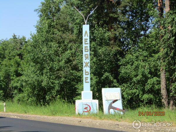 Мы не стали ждать, пока наш автобус минует эту очередь, а сошли с него, и прогулявшись немного по берегу залива, и миновав КПП, оказались вскоре перед вот таким красивым дорожным указателем, обозначающем что мы входим уже в само Лебяжье.
