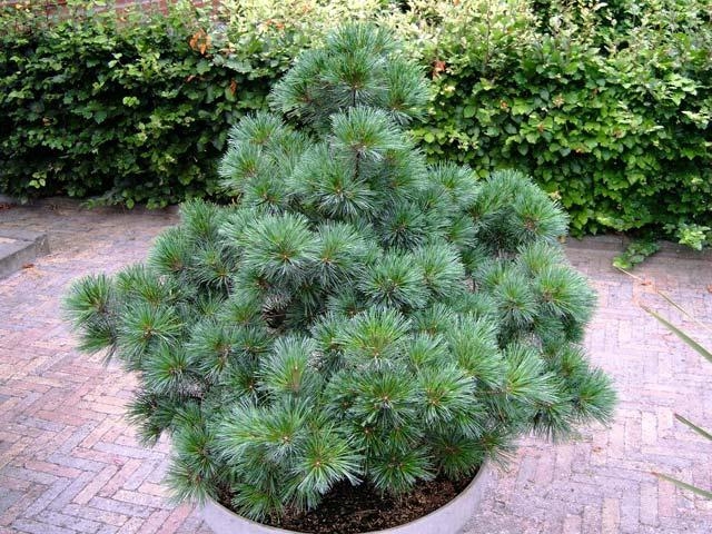 Необыкновенно красива! Невысокий,хвойный кустарник, достигающий в высоту 2 м. Крона округлая или широко конусовидная,очень плотная. С возрастом становится шаровидной. Средняя степень роста. Хвоя голубовато-зеленого цвета, собранная по 5 штук в пучки, густая. Длина хвои – 10 см. Шишки расположены по 1- 8 штук. Длина шишек 7-15 см, ширина – до 4 см. Зрелости достигают ко второму году. Сосна веймутова Radiata (Радиата) хороша для групповых и одиночных посадок. Ее можно использовать для контейнерного выращивания, для озеленения каменистого участка. Отличается высокой теневыносливостью и зимостойкостью. На солнечных местах крона более широкая. Отлично растет на питательной, умеренно увлажненной, дренированной, со слабокислой реакцией почве.