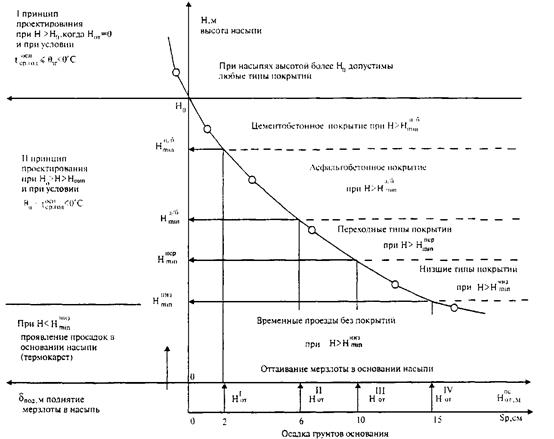 При проектировании и строительстве дорог по второму принципу высота насыпи определяется [39, 40] с учетом возникающих деформаций (осадок) поверхности покрытия, принимаемых по ВСН 46-83 и по рекомендациям проф. Н.А. Пузакова. При этом высота насыпи для дорог с цементобетонным покрытием должна быть выше, чем