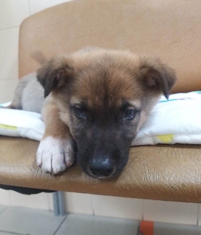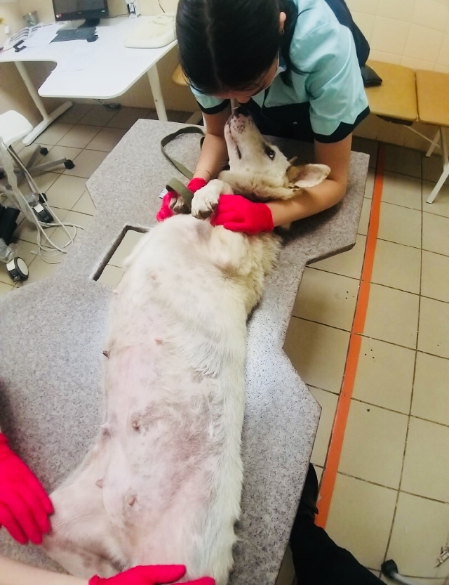 Щенки сейчас на передержке. Собаку сегодня осмотрит врач, проведёт все необходимые анализы, возможно, прооперирует. Собака очень спокойная и добрая.