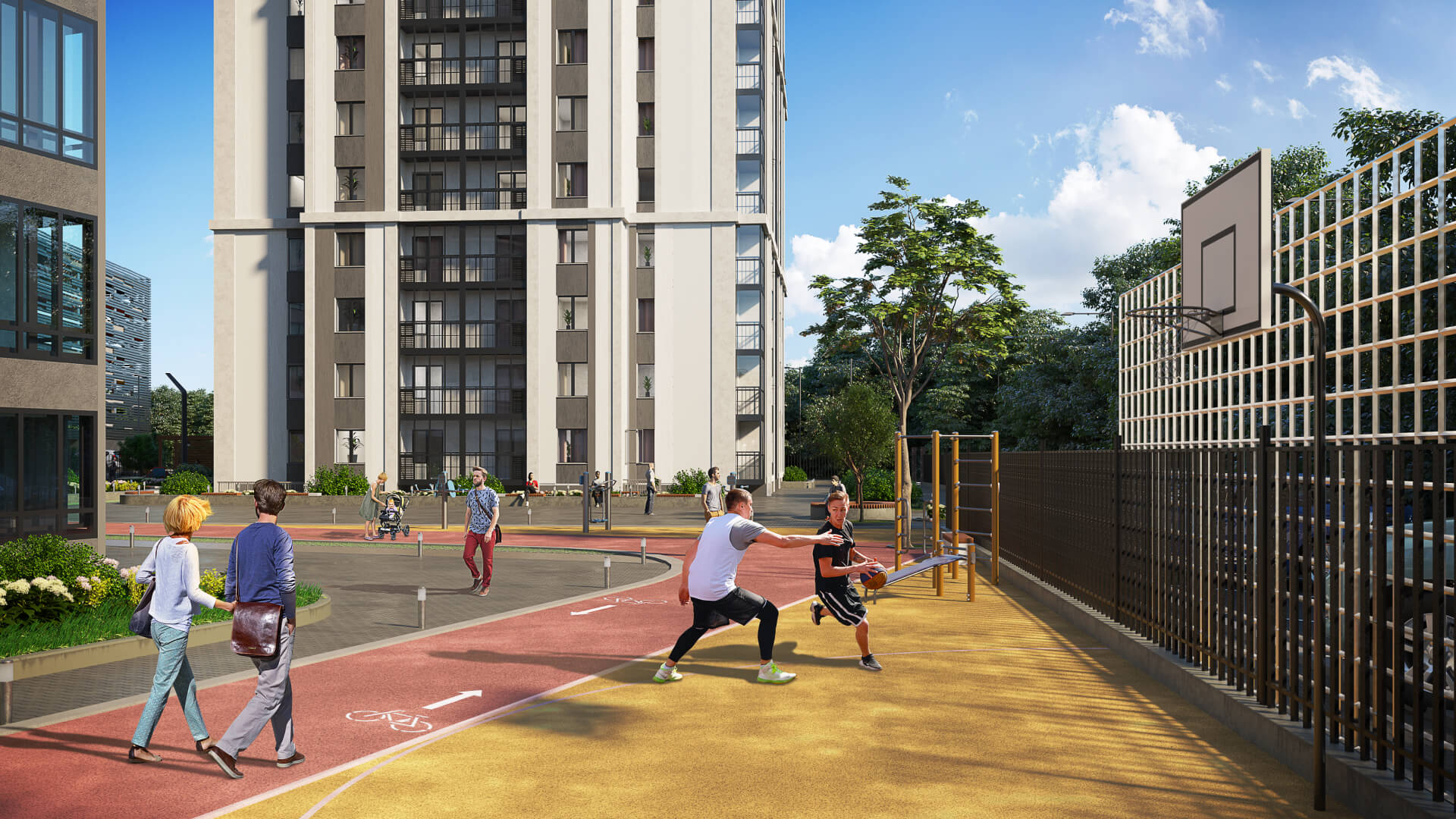 Современные конструкции жилых зданий тянутся к небу, светлые краски в оформлении фасада делают проект легким визуально. А зеленые оттенки отлично вписывают новый жилой комплекс в окружающую среду.