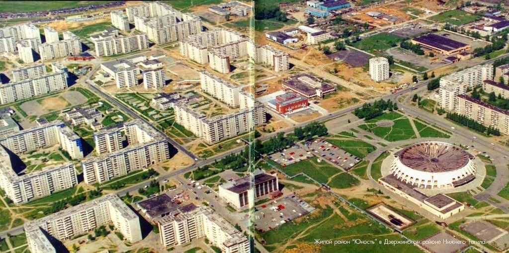 Фото с птичьего полёта микрорайон Юность и почти в центре справа круглое сооружение Дворец Ледового спорта имени В. К. Сотникова.
