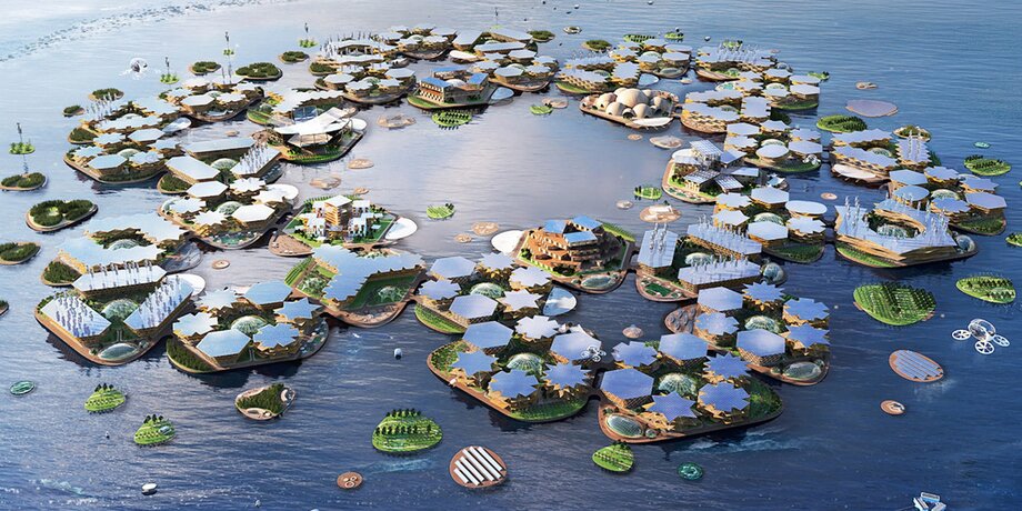 Недавно в Организации Объединенных Наций был проведен специальный круглый стол, посвященный возможному созданию плавучих городов. Место, в котором проходило заседание, можно считать символичным: Нью-Йоркская штаб-квартира организации, расположенная на берегу Ист-Ривер, к концу века также окажется под водой. Специальной темой обсуждения был проект Oceanix City: масштабируемая платформа для жизни людей на поверхности океана. Автором идеи является архитектор из Дании Бьярке Ингельс, который и сам живет в плавучем доме собственной конструкции. Совместно с множеством специалистов Бьярке разрабатывает проект, согласно которому люди, живущие в плавучих городах, будут использовать только возобновляемую энергию, питаться исключительно растительной пищей и не производить никаких отходов.