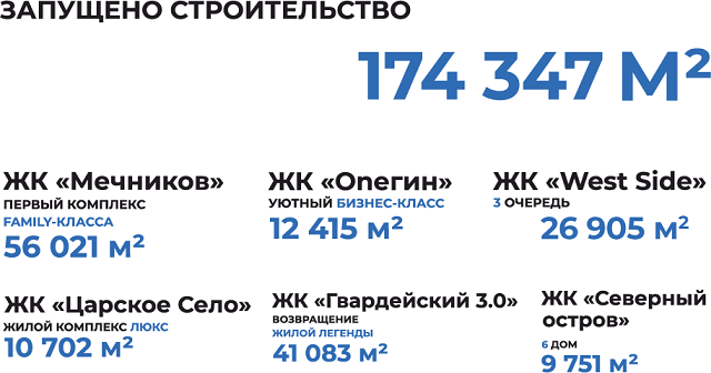 Также в планах на 2-е полугодие: сдача ЖК «Вдохновение» и 2-й очереди ЖК «Гвардейский-2».