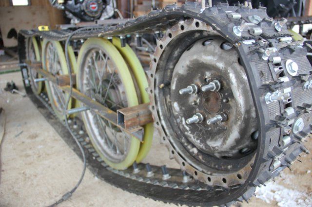 7) Гусеницы: по 2 шт на сторону от снегохода буран, распиленные вдоль и сшитые.