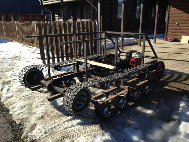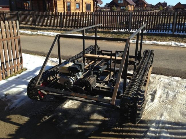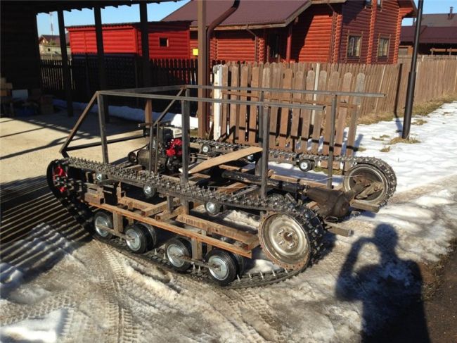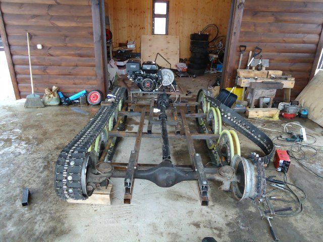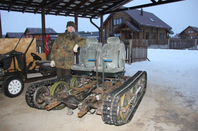 Уважаемые посетители сайта «Самоделкин друг» из представленного автором материала вы узнаете как он собирал свой гусеничный вездеход, применяя автозапчасти от Советских автомобилей. Автором данной машины повышенной проходимости является Сергей из города Псков, при желании вы можете найти его на форуме «луноходов.нет» Начало постройки вездехода отмечено первого числа марта 2011 года, а закончено уже к осени этого же года, тоесть машина была создана довольно быстро, это говорит о высоком профессионализме конструктора и автора данного вездехода. Работа была проведена очень серьезная, трудная и кропотливая, не все получалось с первого раза, были и переделки, доработки — это не смотря на то что мастер предварительно сделал чертежи и наброски, провел соответствующие расчеты. В ходе испытаний были внесены правки в конструкцию ходовой, а именно укорочены балансиры на 80 мм. А в остальном машина получилась отличная, благодаря золотым рукам автора и его профессионализму.