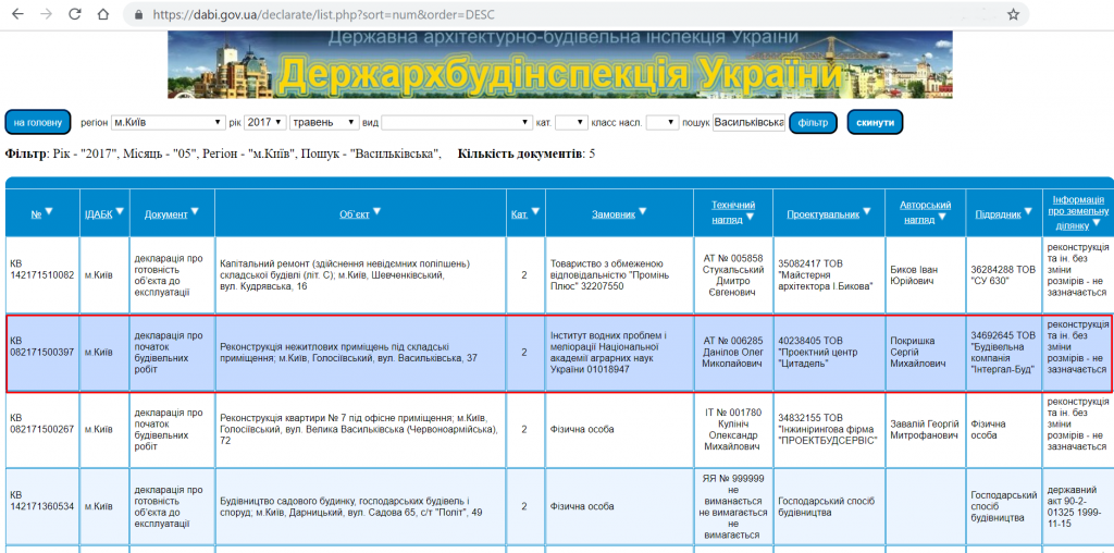 Если говорить о разрешительной документации, то мне, к сожалению, не удалось найти ни Градостроительных условий и ограничений для проектирования по ул. Васильковской, 37, ни Разрешения, выданного для строительства по этому адресу. Единственный документ, который мне удалось найти в базе данных ДАБИ — Декларация о начале строительных работ по реконструкции нежилых помещений в складские, зарегистрированная в мае 2017 года.