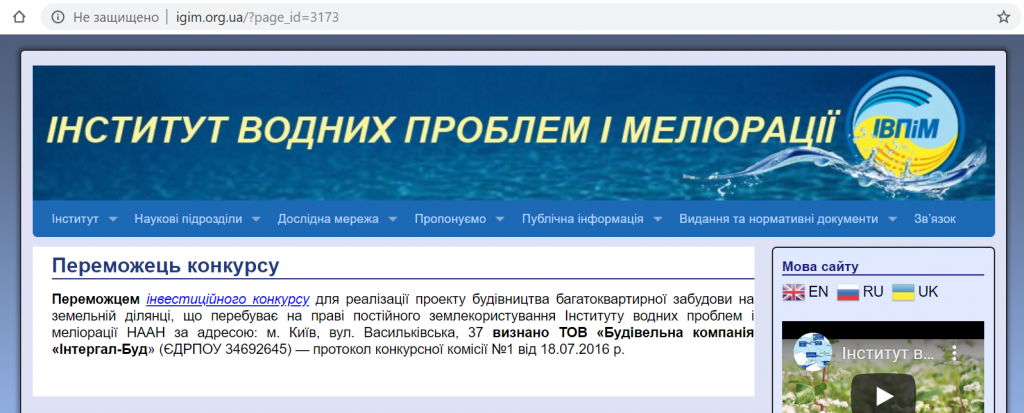 В 2016 году институт водных проблем и мелиорации провел инвестиционный конкурс на реализацию проекта жилой застройки участка с кадастровым номером 8000000000:79:365:0036 (целевое назначение — 02.10 Для будівництва і обслуговування багатоквартирного житлового будинку з об’єктами торгово-розважальної та ринкової інфраструктури), победителем которого, собственно и стал «Интергал-Буд».