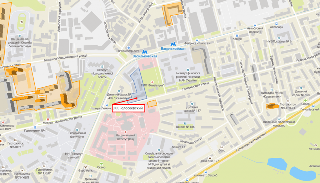 Эта часть Голосеево находится в некотором отдалении от знаменитого парка — чтобы прогуляться в нем, придется минут 15 пройтись. Но зато здесь мощная учебная и лечебная инфраструктура. В соседнем с будущей новостройкой здании располагается центральный городской туберкулезный диспансер, а напротив стоят корпуса Национального института рака. Поблизости расположены учебные корпуса и общежития нескольких вузов, в том числе, и университета Шевченко. Также в округе масса школ и детских садиков, различных магазинов, кафешек, салонов красоты и прочих необходимых для удобной жизни заведений. Плюс — станция метро «Васильковская» в шаговой доступности.