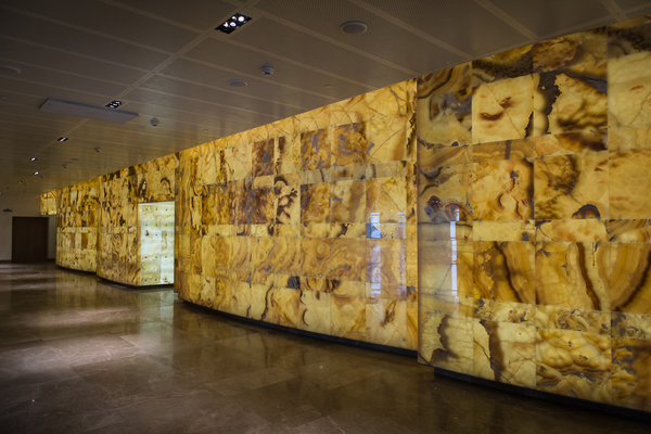 Слоистый минерал, который любят использовать в интерьере дорогие азиатские отели. В фойе новой Мариинки — гигантские панели из оникса, подсвеченные светодиодами изнутри. По мнению Валерия Гергиева, благодаря желтому сиянию невзрачный стеклянный фасад заиграет совершенно другими красками.
