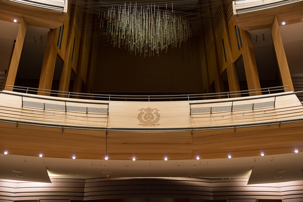 Сделанный в форме подковы зал на 2000 мест — рациональное пространство без лишних украшений. Здесь нет «слепых мест» — всю сцену видно даже с самой высокой точки. Стены отделаны специальными акустическими гипсовыми панелями, ярусы разделены панелями из бука и дуба, кресла серые, в меру удобные — вот, собственно, и все. Кроме главного зала есть еще площадки поменьше — для камерных концертов, лекций и выставок. Летом обещают задействовать террасу на крыше — но пускать полюбоваться на город будут, кажется, не всех подряд.