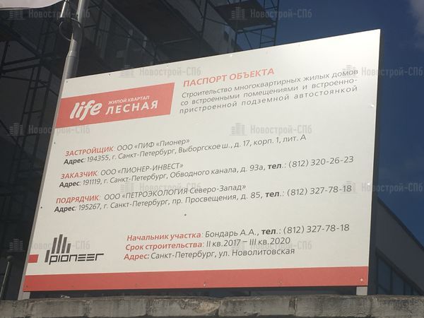 Застройщиком «LIFE-Лесная» является ООО «Петербургская инвестиционная фирма «Пионер» – «дочка» группы компаний «Пионер», под брендом которой объект и реализуется. По информации с официального сайта, ГК «Пионер» ведет деятельность по реализации градостроительных проектов многофункциональной и комплексной жилой застройки с последующим управлением и сервисным обслуживанием.