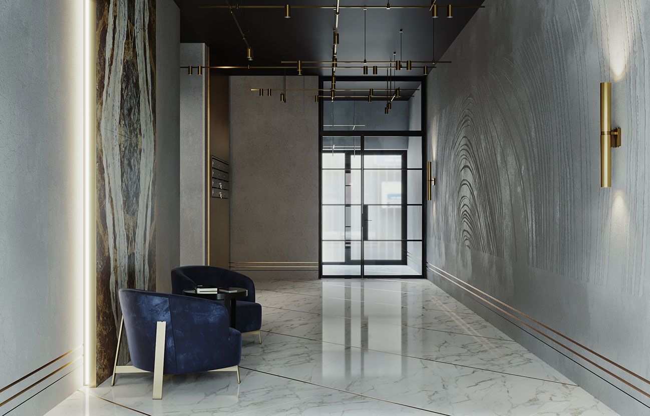 В отделке лобби используются премиальные материалы – мрамор, бронзовые элементы и итальянские системы освещения. А современная мебель в темно-синих тонах идеально дополняет дизайн-проект. Система доступа в дом по Face ID.