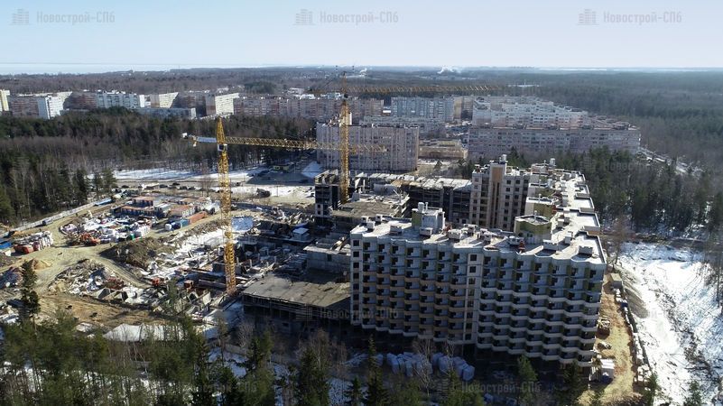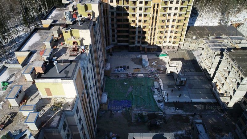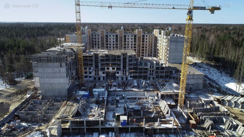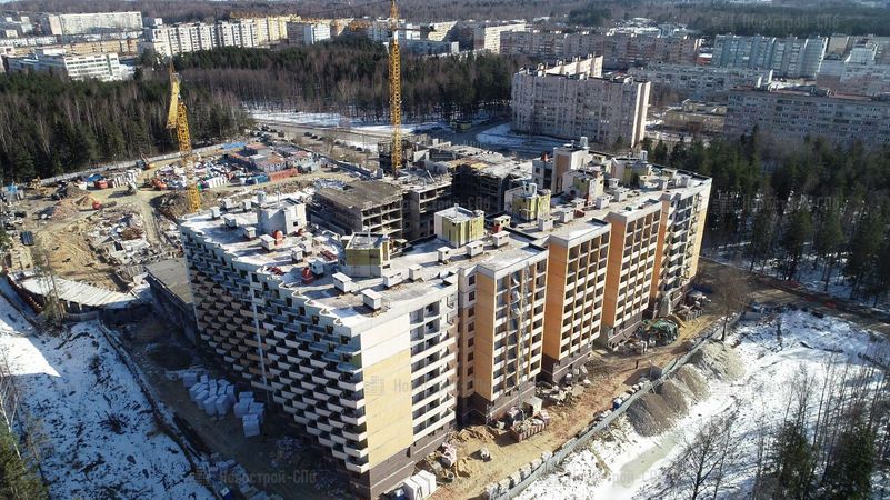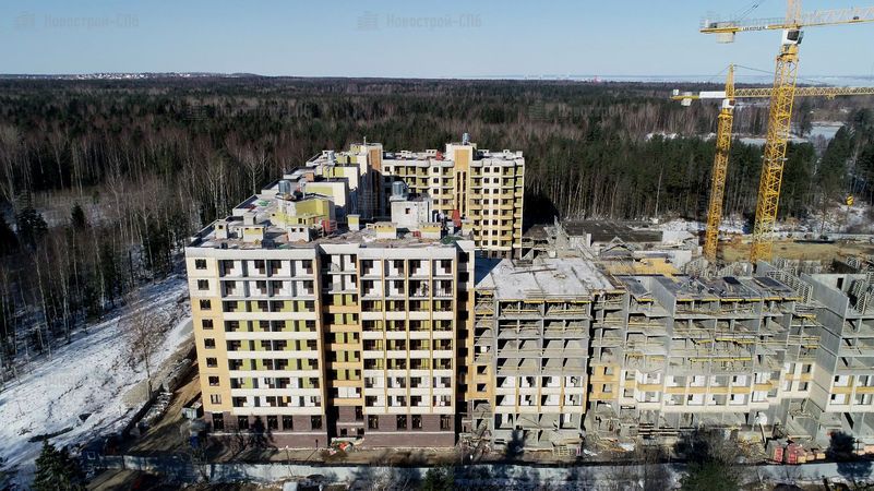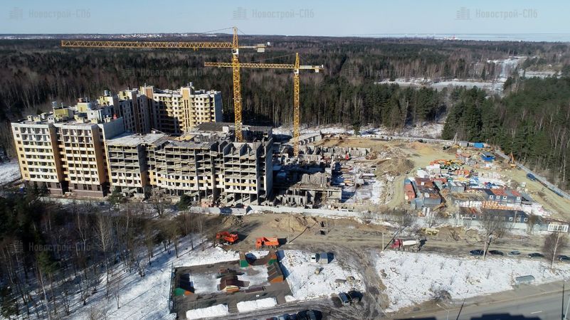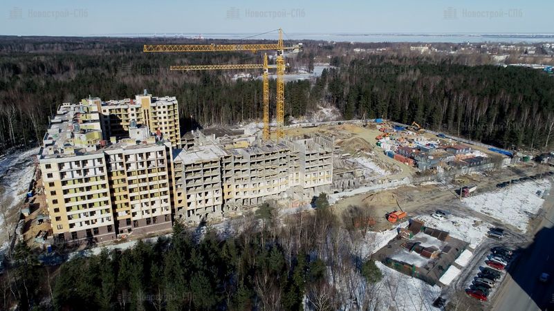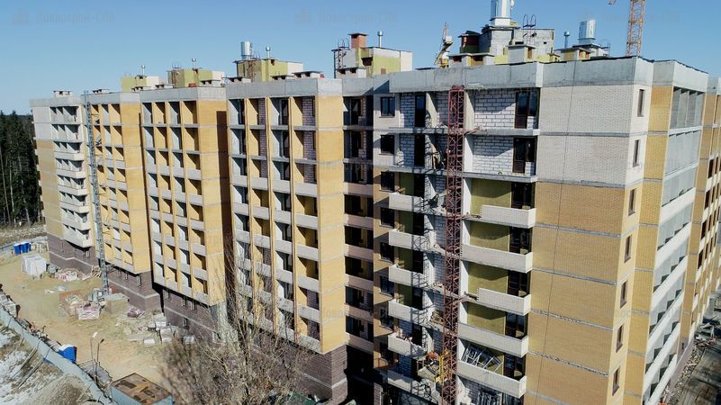Четыре дома будут сдавать постепенно, в четыре этапа. Сдача первого корпуса изначально была намечена на II кв. 2017 года, но сроки сдачи перенесли на III кв. 2018 года. Окончание строительства других домов также перенесено (см. таблицу ниже). Во время моего посещения (начало 2018 года) 1 корпус был возведен под крышу, облицован и там велись внутренние работы. 2 корпус был на этапе монтажа средних этажей, 3 корпуса не было видно из-за забора, а 4 корпус находился на нулевом цикле строительства.