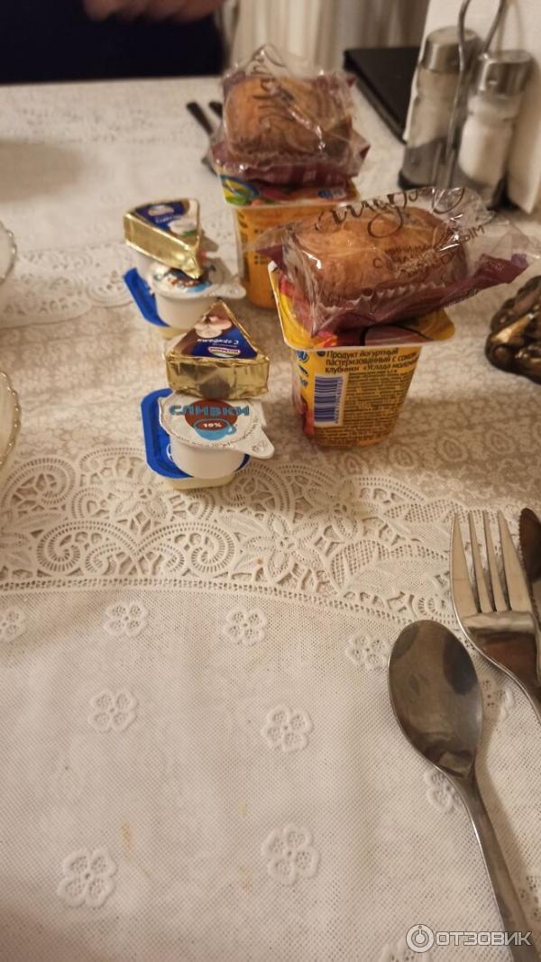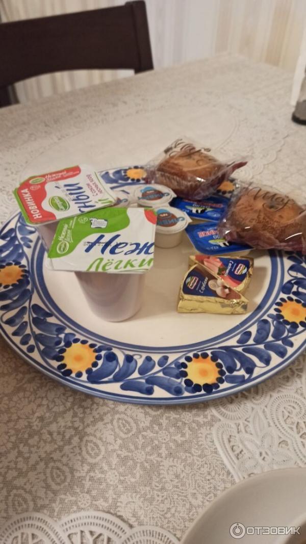 А также нам подали плавленый сыр, сливочное масло, йогурты, кексики и сливки для кофе.