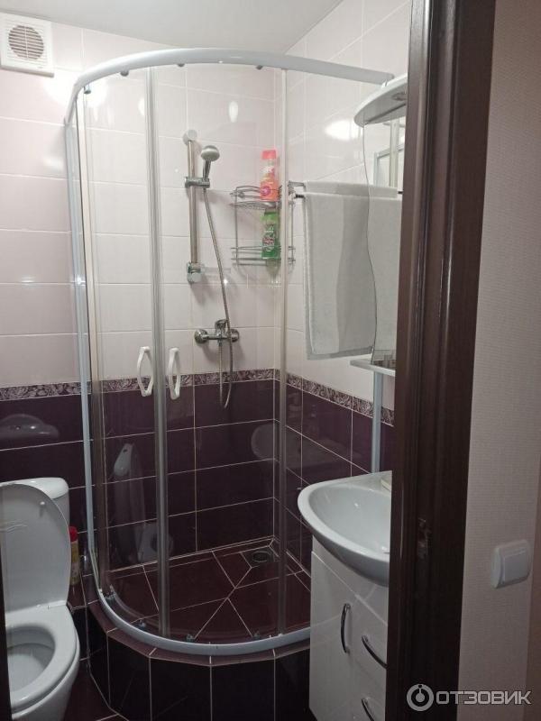 В ванной у нас была душевая кабина, раковина, зеркало, тумбочка, на полу коврик. Когда включаешь свет, то сразу же включается и вентиляция. В ванной полотенцесушитель всегда теплый, поэтому температура комфортная и полотенца быстро высыхают. На раковине стоит жидкое мыло.