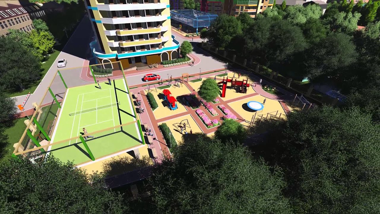 В центральной части жилого комплекса находится мини-парк. В нем располагаются детские площадки, спортивный комплекс, зоны для отдыха и прогулок. Спортивный комплекс состоит из двух этажей. На первом этаже есть несколько зон с тренажерами, мини-поля для игр в футбол, баскетбол, волейбол. На втором этаже размещен большой теннисный корт и настольный теннис. Весь комплекс накрыт полупрозрачным куполом.