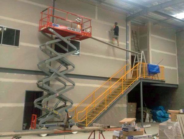 Шпаклевка стен с помощью ножничного подъемника и подручных лестниц