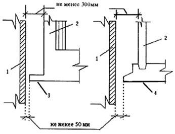 Устройство осадочных швов в перекрытиях путем свободногоопирания их элементов на стены существующих зданий запрещается. Осадочные швы в стенах и зазор между существующими и ограждающими стенами нового здания должны обеспечивать свободное перемещение их при возможных кренах нового и существующего зданий. Заполнение зазоров в плоскостях наружных стен примыкающих зданий надлежит выполнять тонкими декоративными элементами, способными деформироваться при замыкании шва и не передавать усилия на основные конструкции зданий (рис. 1.4). Величина зазора между стеной существующего здания и несущими или ограждающими конструкциями нового не должна быть менее 300 мм